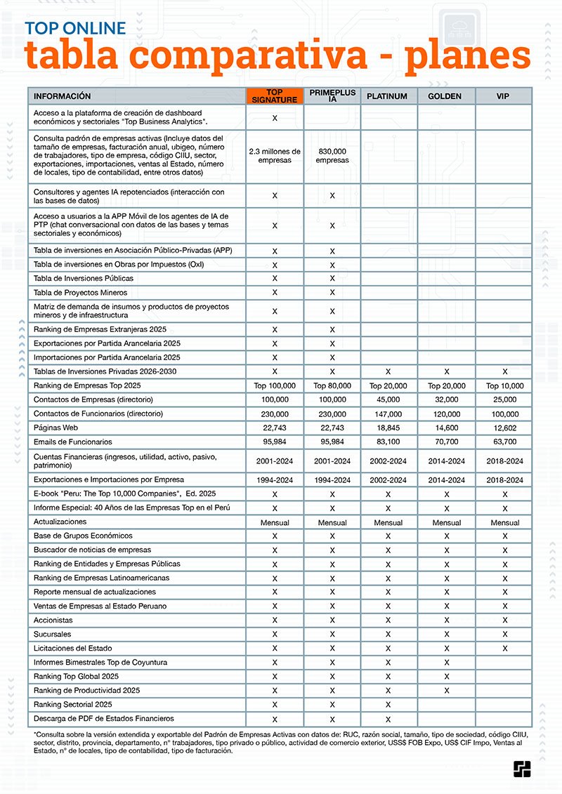 - Información sobre empresas con ventas desde S/3 millones hasta S/16,000 millones.